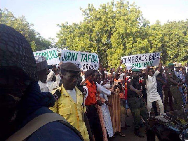 Many of the Sokoto residents who came to welcome former President Goodluck Jonathan yesterday, Thursday, when he visited the Sultan of Sokoto and the family of his National Security Advisers, Dasuki Sambo over the death of late Alhaji Ibrahim Dasuki a former Sultan who died at the age of 93 on Monday in Sokoto carried placards some with the inscription ‘Come back Baba Jonathan’.