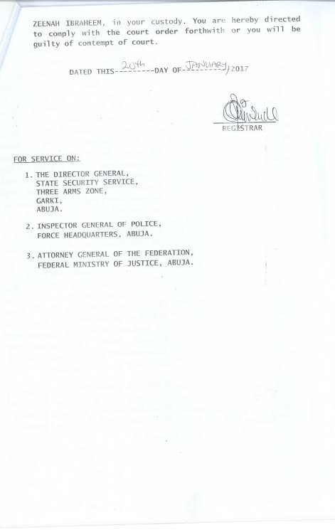 The notice sent to the trio, reads in part: “Take notice that unless you obey the direction contained in the order of the Federal High Court of Justice Abuja, delivered on the 2nd December, 2016, which ordered you to release the Applicants in Suit No. FHC/ABJ/CS/281/2016 and its sister case Suit No. FHC/ABJ/CS/282/2016 within forty (40) days, inter alia you will be guilty of contempt of court and will be liable to be committed to prison.”