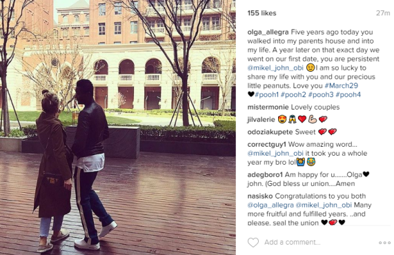 "Five years ago today you walked into my parents house and into my life. A year later on that exact day we went on our first date, you are persistent @mikel_john_obi. I am so lucky to share my life with you and our precious little peanuts. Love you #March29 #pooh1 #pooh2 #pooh3 #pooh4"