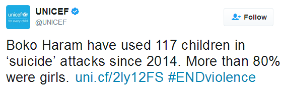 Boko Haram have used 117 children, mostly girl in suicide attacks since 2014 - UNICEF