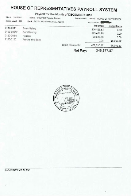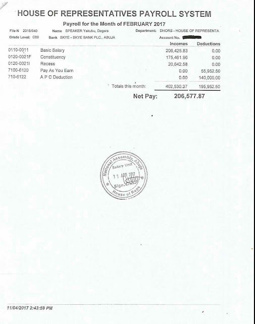 The pay slips which covered Dogara’s salary between the months of October 2016 to March 2017 was released by the Speaker’s spokesperson, Turaki Hassan, on Tuesday.
