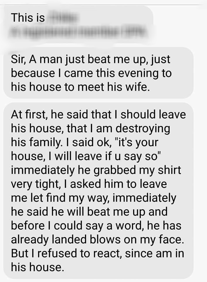 According to Emeka Ugwuonye of DPA who shared the story, a man recently visited a woman he claimed to help set up a business but ended up with a broken nose when the husband beat him for allegedly interfering with his marital affairs.