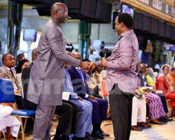 Football icon and leading Liberia’s presidential candidate, George Weah, on Sunday visited the Synagogue Church of All Nations in Ikotun, Lagos, to seek the spiritual support of Prophet TB Joshua, in his bid to lead Liberia.