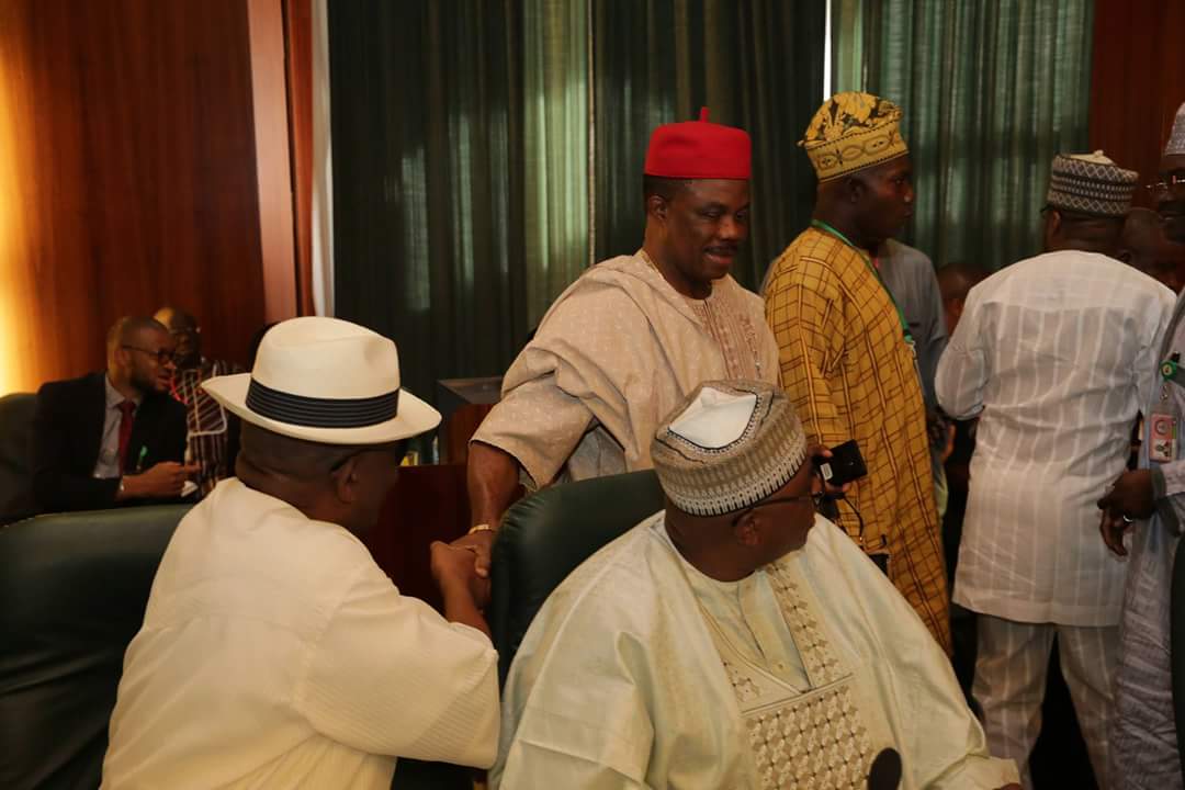 | Kano State Governor, Alhaji Abdullahi Ganduje congratulating Governor Willie Obiano of Anambra State (l) during the meeting of the National Economic Council at the State House, Abuja. 23/11/2017 |