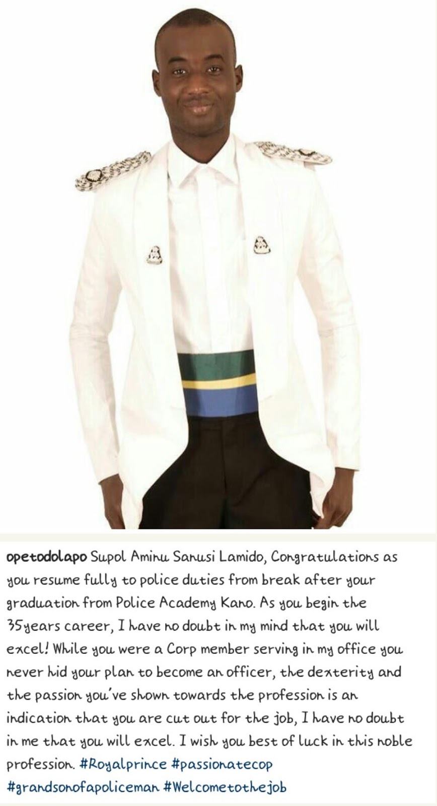 Supol Aminu Sanusi, the son of the former CBN governor and current Emir of Kano, Sanusi Lamido Sanusi has officially resumed duty as a police officer.